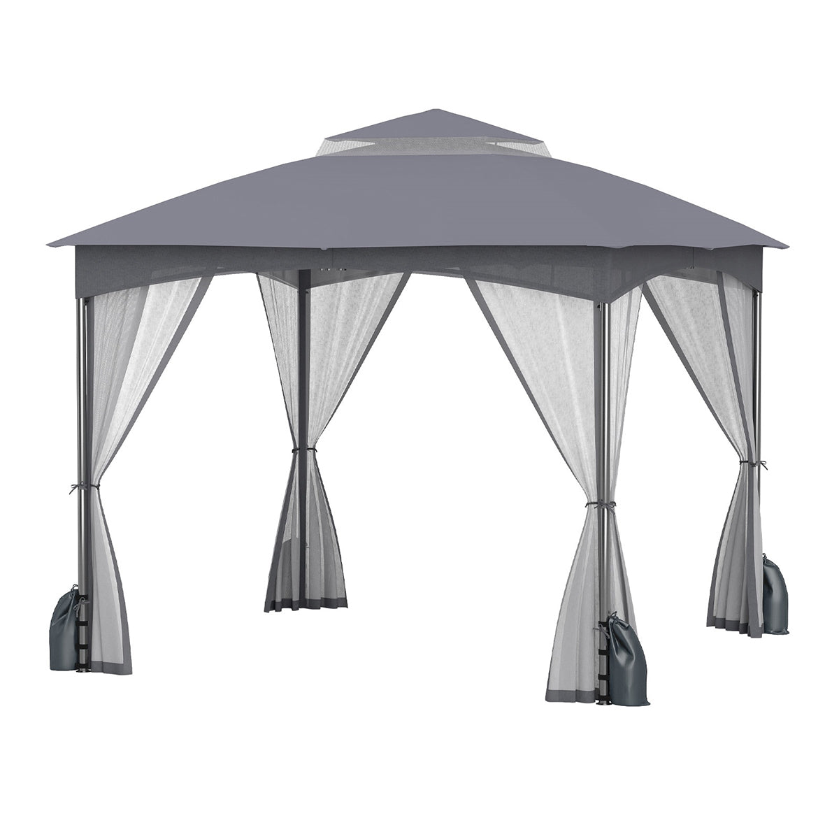 Toldo para Pátio 300 x 300 CM com Paredes de Rede, Teto Duplo, 4 Sacos de Areia, Portas com Fecho de Correr, Estrutura Metálica Resistente em Cinzento