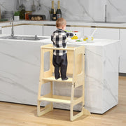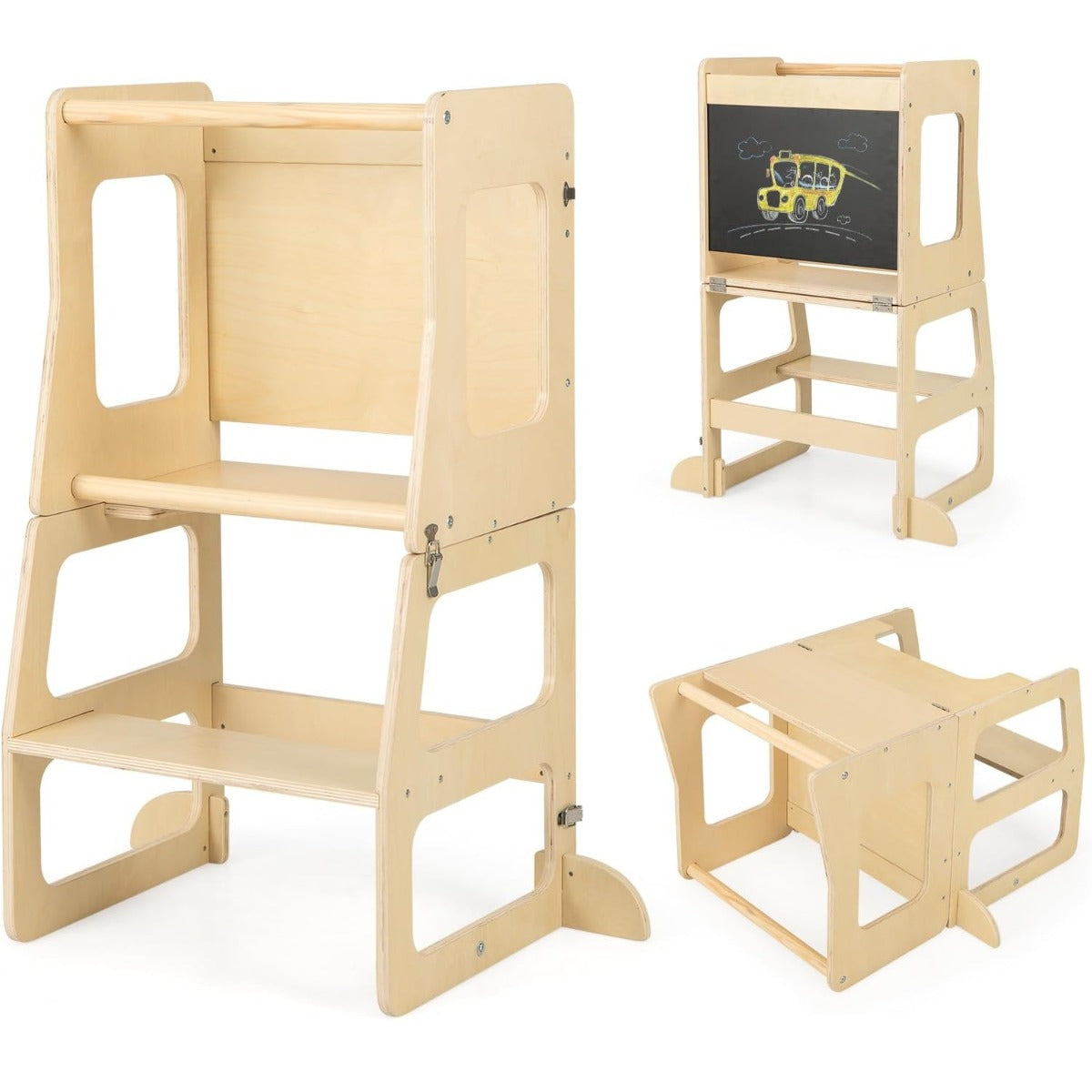 Torre de Aprendizagem para Crianças com Quadro Negro Banqueta Dobrável 2 em 1 com Grade de Segurança Capacidade 60 kg Natural