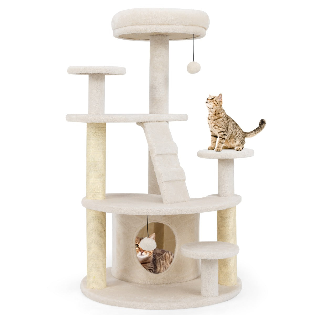 Com uma percha superior espessa e acolchoada, os teus adorados gatinhos podem descansar ou observar o mundo a partir da torre para gatos de vários níveis. Além disso, o teu gato encontrará conforto e privacidade no espaçoso condomínio enquanto se mantém entretido com os postes de sisal para arranhar. A corda de sisal natural de qualidade premium é resistente ao desgaste e segura. Com tecido de peluche suave, o centro de atividades permite aos gatos desfrutar de um conforto melhorado. Além disso, a escada facilita aos gatos alcançar diferentes níveis, enquanto a plataforma fornece muito espaço para se exercitar, brincar e descansar. A base ampla e múltiplos postes de suporte garantem uma estabilidade confiável.