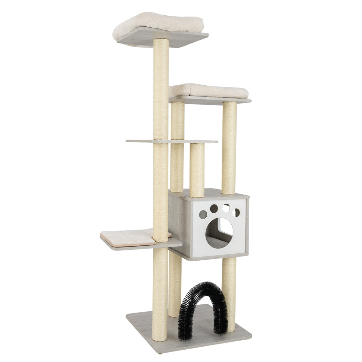 Mantenha os seus gatos felizes com a nossa torre para gatos de 176 cm! Esta torre para gatos possui um condomínio com 2 portas que oferece privacidade para se esconder e conta com uma entrada lateral para escapar. 2 luxuosas plataformas com camas de peluche criam uma área alta e acolhedora para o máximo conforto e uma vista panorâmica da casa. A estrutura alta liberta a natureza e permite que o gato trepe e salte. Totalmente revestido com sisal para os gatos afiarem as unhas, os resistentes postes de sisal proporcionam horas de diversão a arranhar. O gato vai adorar a sensação de massagem ao esfregar-se e passar pelo arco de escovagem automática. Esta torre para gatos com um visual caloroso e acolhedor atrai a atenção sua e dos gatos.