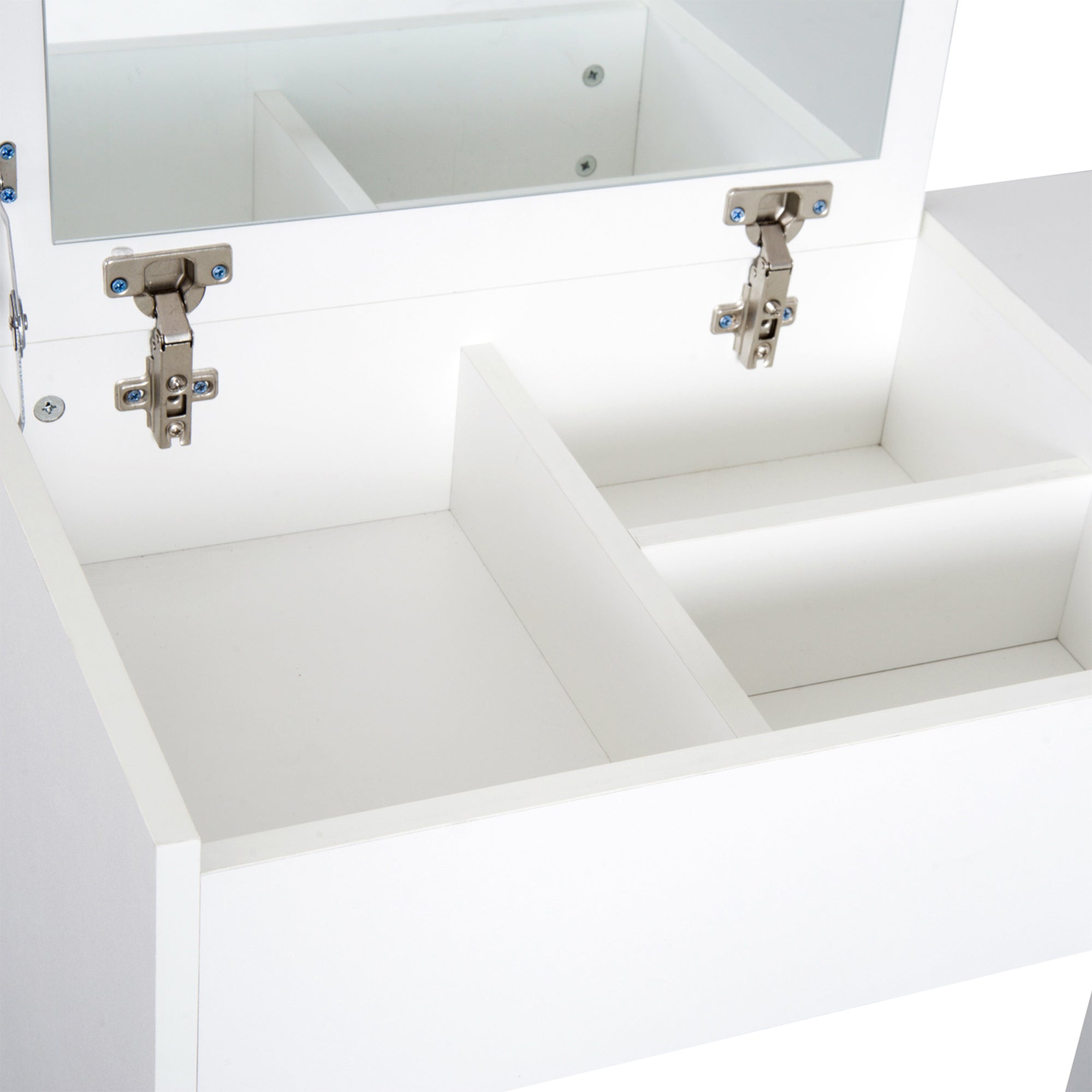 - Benefícios: Inclui compartimentos variados embaixo do espelho e uma gaveta para organização, banco acolchoado para conforto prolongado