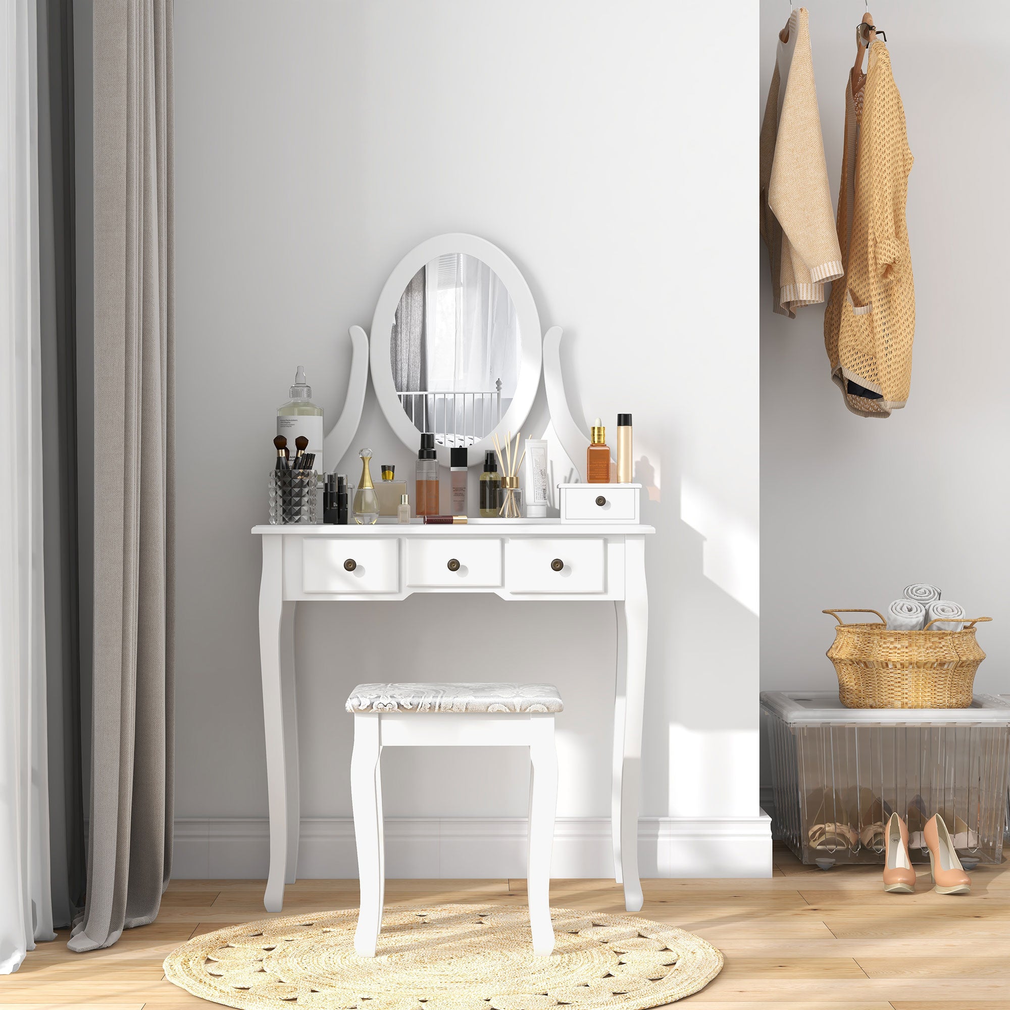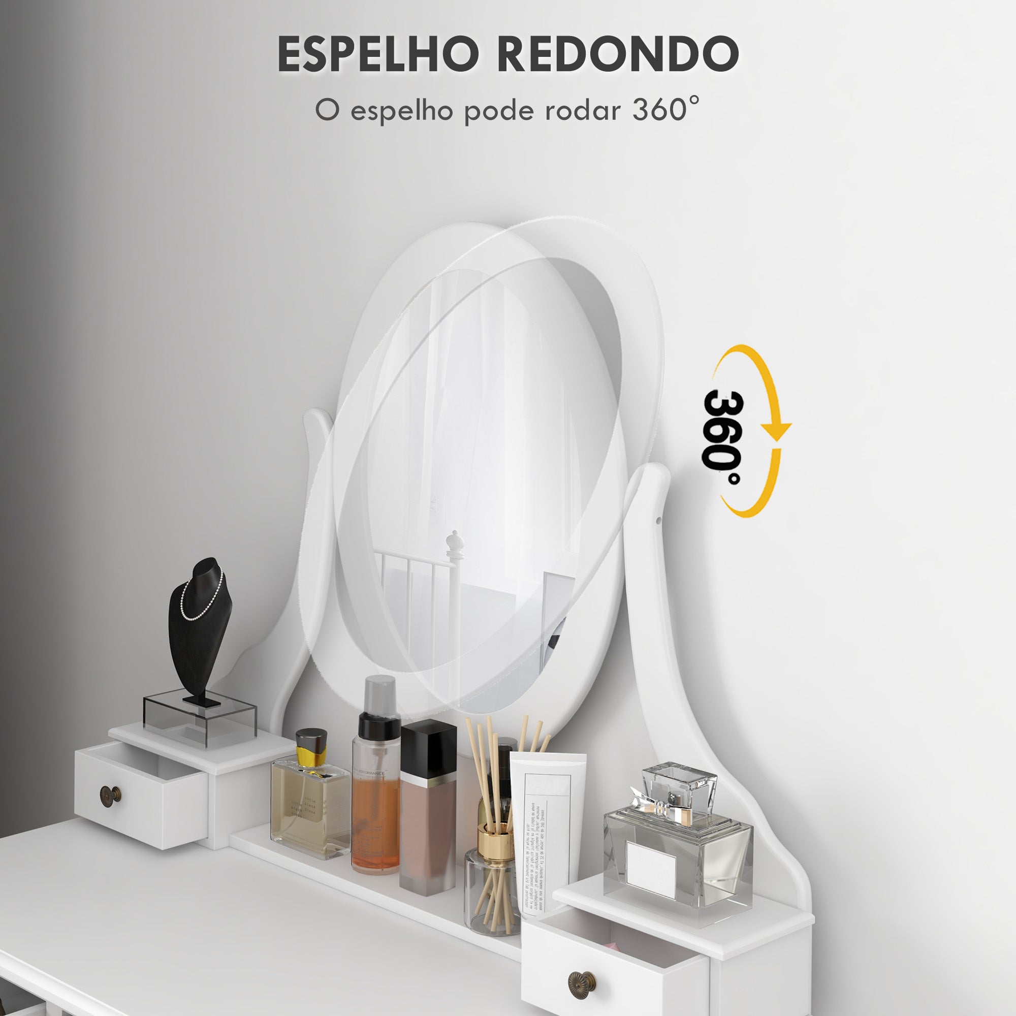 - Benefícios: Espelho rotativo 360°, espaço de armazenamento múltiplo com 5 gavetas, banco acolchoado com capacidade de 150kg
