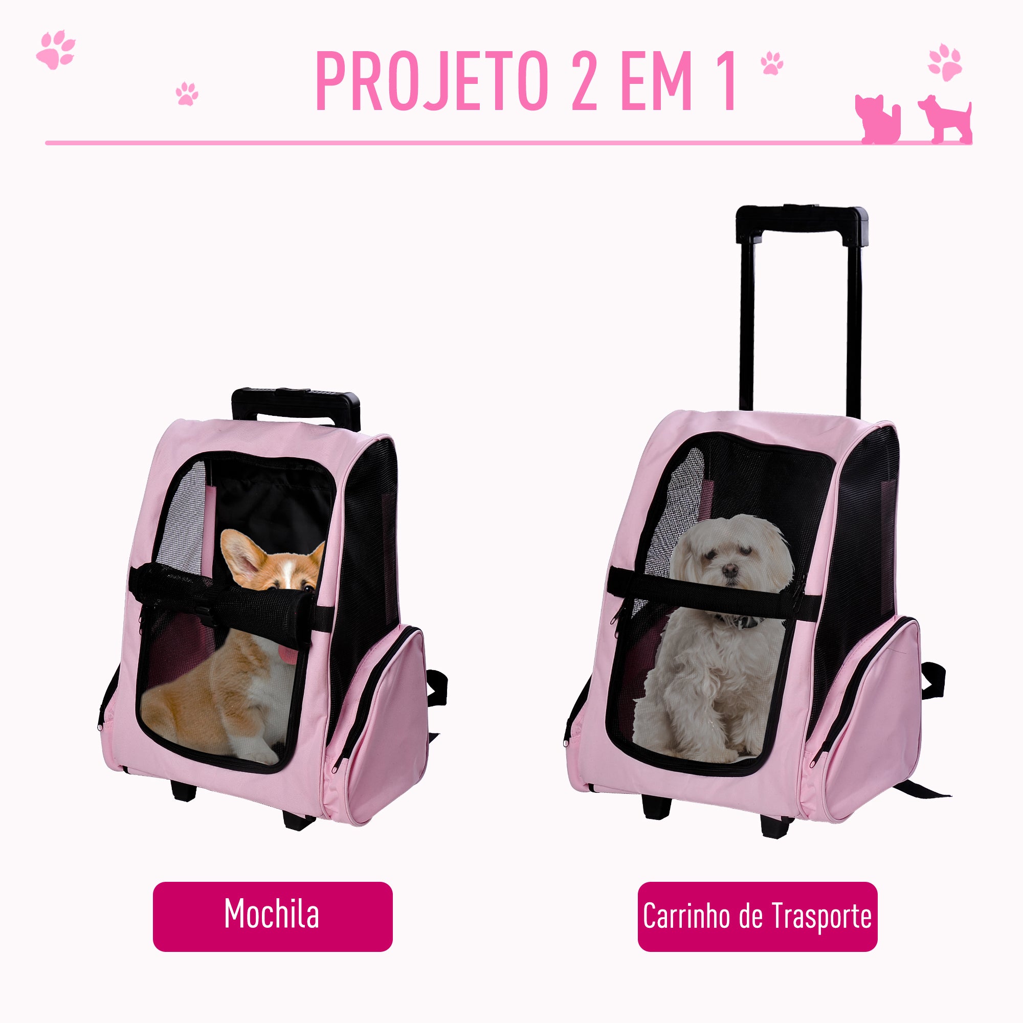 Esta versátil transportadora para animais de estimação pode ser utilizada como carrinho com rodas ou como mochila, proporcionando facilidade de transporte em qualquer situação. Com design 2 em 1, alça retrátil de alumínio e bolso de armazenamento, é ideal para cães e gatos.