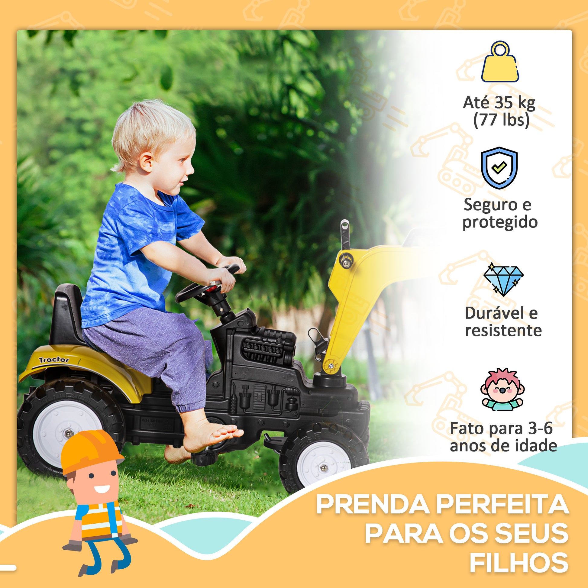 Este trator a pedais para crianças apresenta um design realista que imita uma escavadora, proporcionando horas de diversão criativa. Com uma pá dianteira controlável e braços flexíveis, as crianças podem movimentar-se para a frente e para trás, estimulando a imaginação enquanto brincam.
