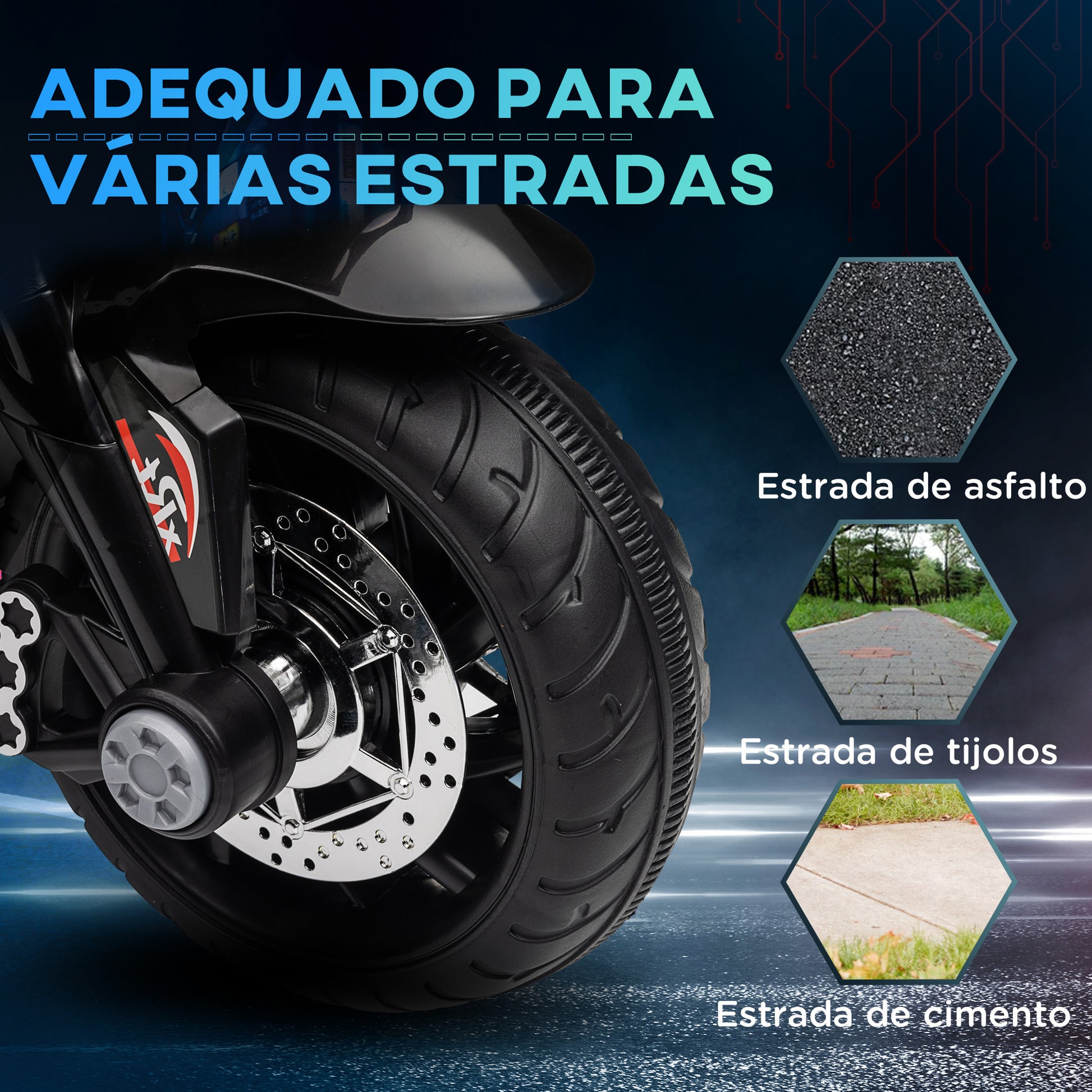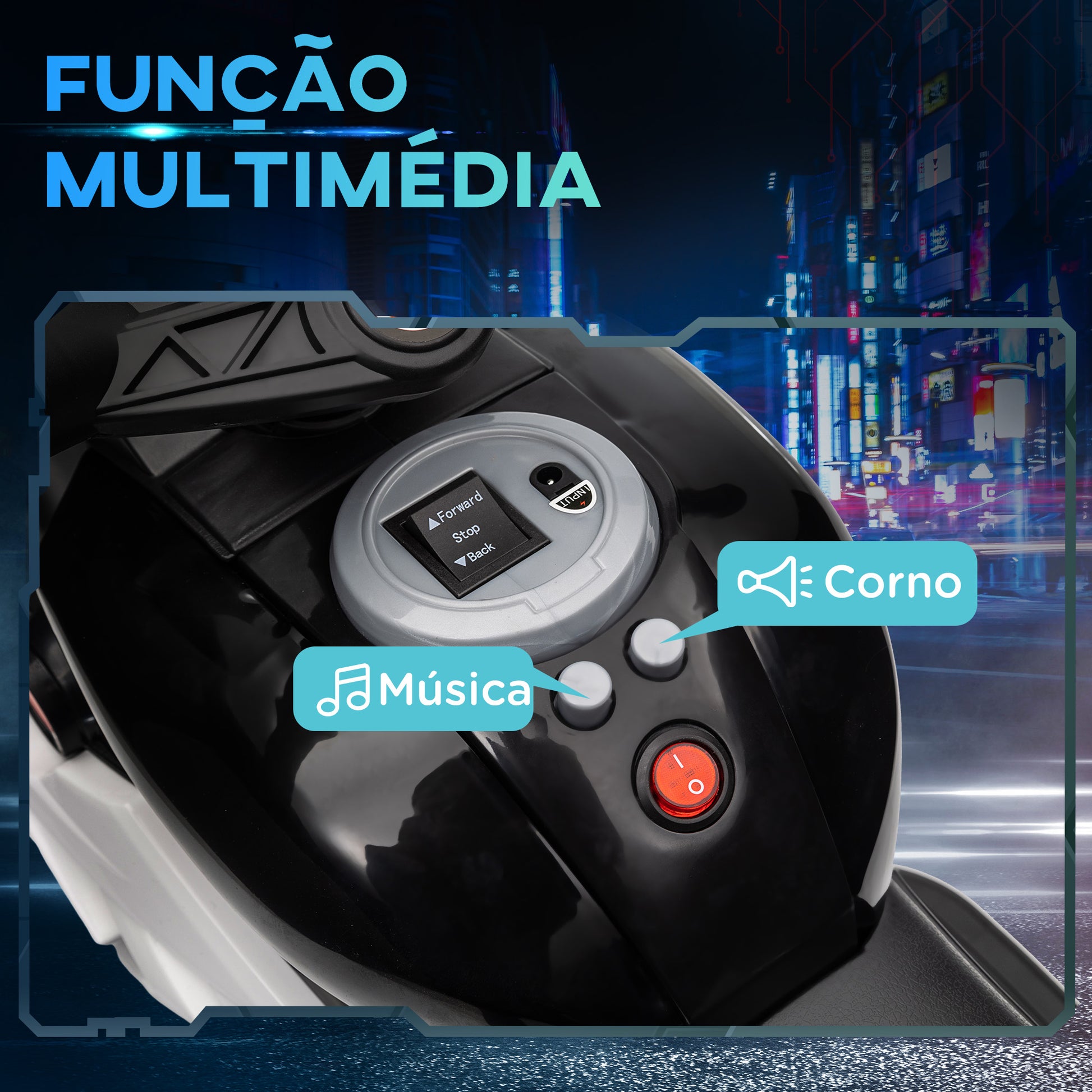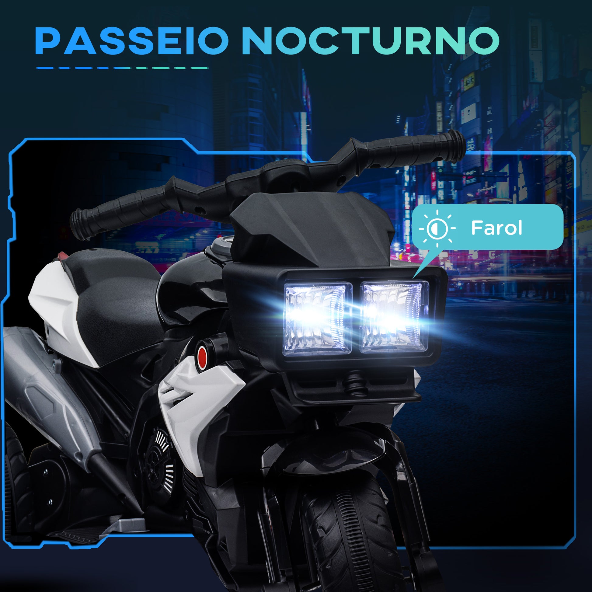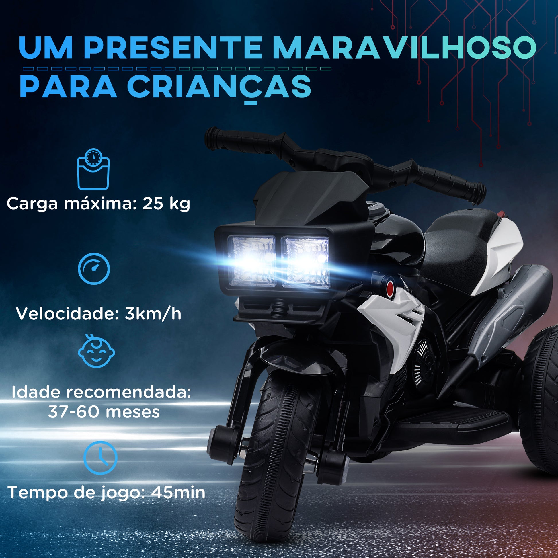- Benefícios: Velocidade máxima limitada a 3km/h, autonomia de até 45 minutos, faróis dianteiros com luzes reais, música ativada por botão, pneus largos para condução estável