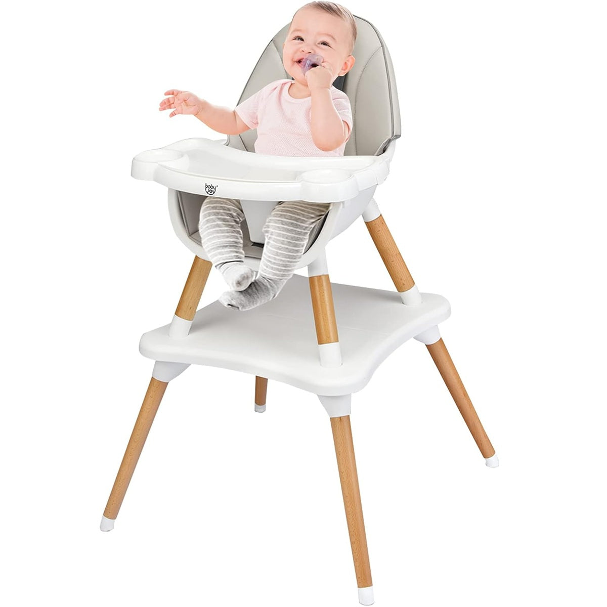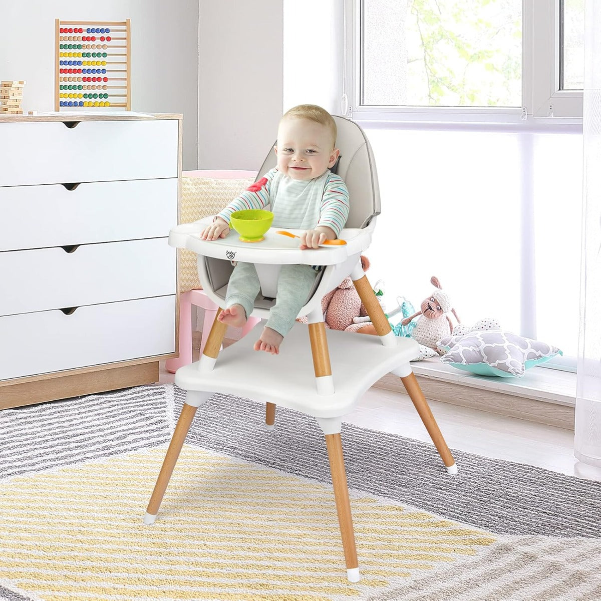 Características: Trona multifuncional para bebé, transforma-se em cadeira e mesa para refeições. Almofadado em PU para conforto do bebé. Bandeja ajustável em altura com 4 posições. Pernas de madeira maciça para estabilidade e durabilidade. Bandeja e almofadado removíveis para limpeza fácil.