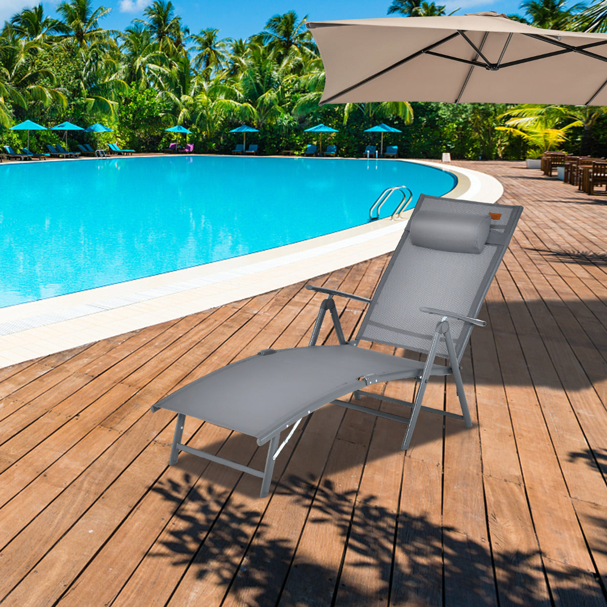 Tumbona Dobrável Cadeira Reclinável de Pátio Portátil Encosto Ajustável em 7 Posições Suporta 150 kg para Piscina Praia Varanda Cinzenta