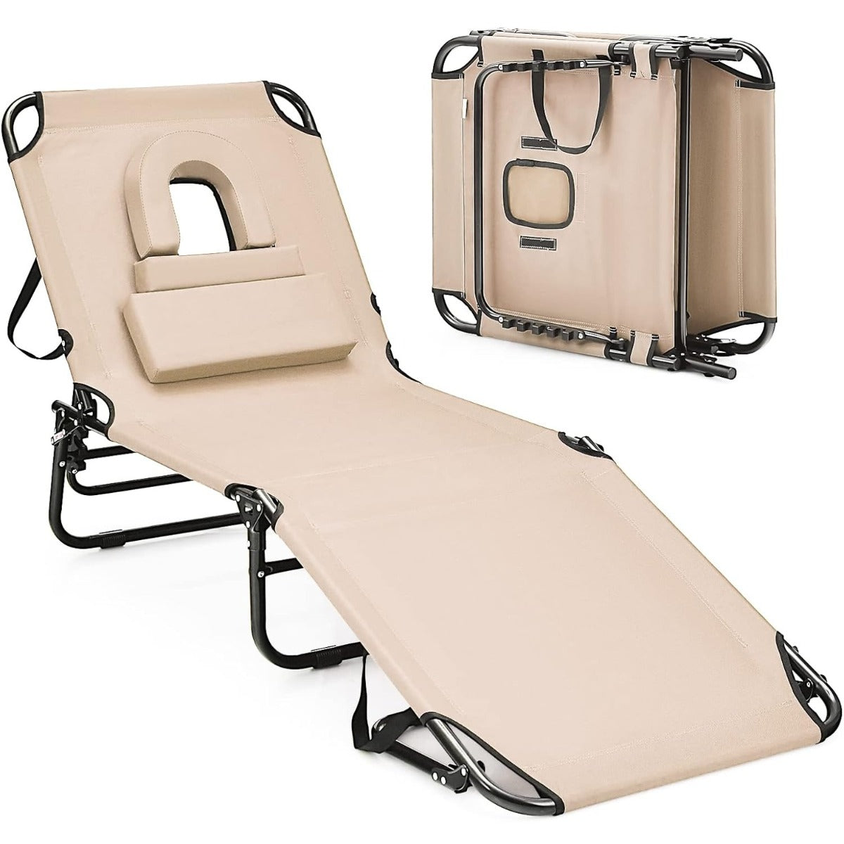 Tumbona Dobrável com Orifício para Rosto Almofada Removível e Encosto Ajustável em 5 Posições Tecido Oxford Suporta 160kg Bege