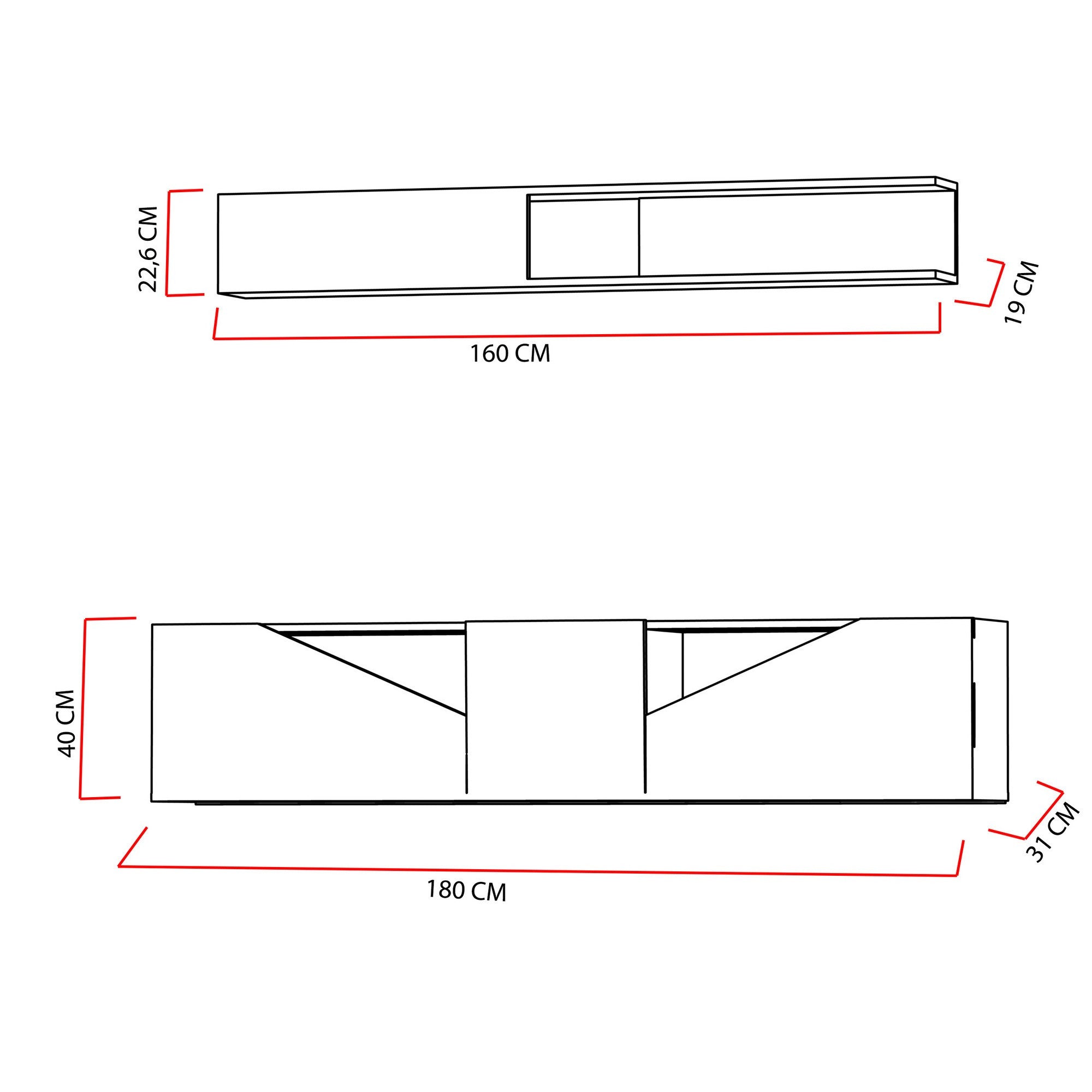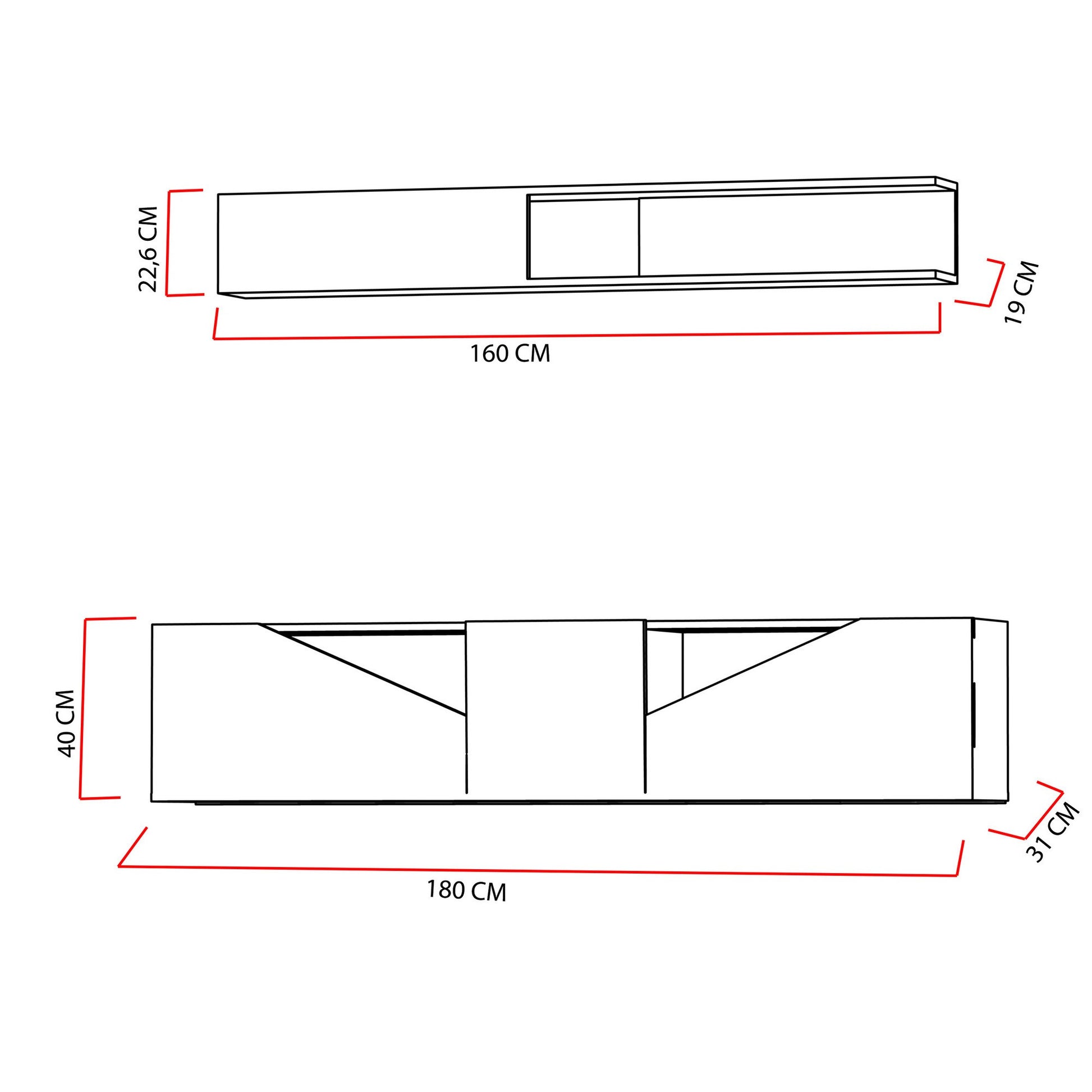 - Tamanho do móvel para TV: Largura: 180 cm, Altura: 40 cm, Profundidade: 31 cm