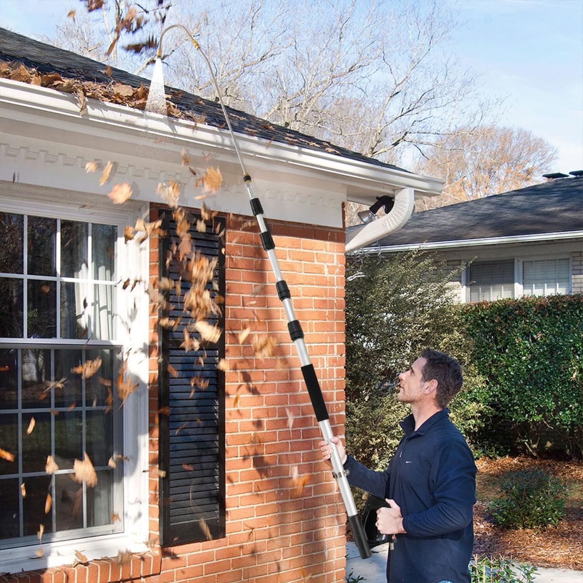 - Vara Extensível de 5 Secções: Esta vara extensível de 5 secções permite uma limpeza completa em áreas de difícil acesso. Basta rodar as porcas de bloqueio e estender cada secção até ao comprimento ideal. Além disso, com uma vara de extensão de 15° e um acessório de limpeza de caleiras, todo o kit pode alcançar até 215-550 cm.