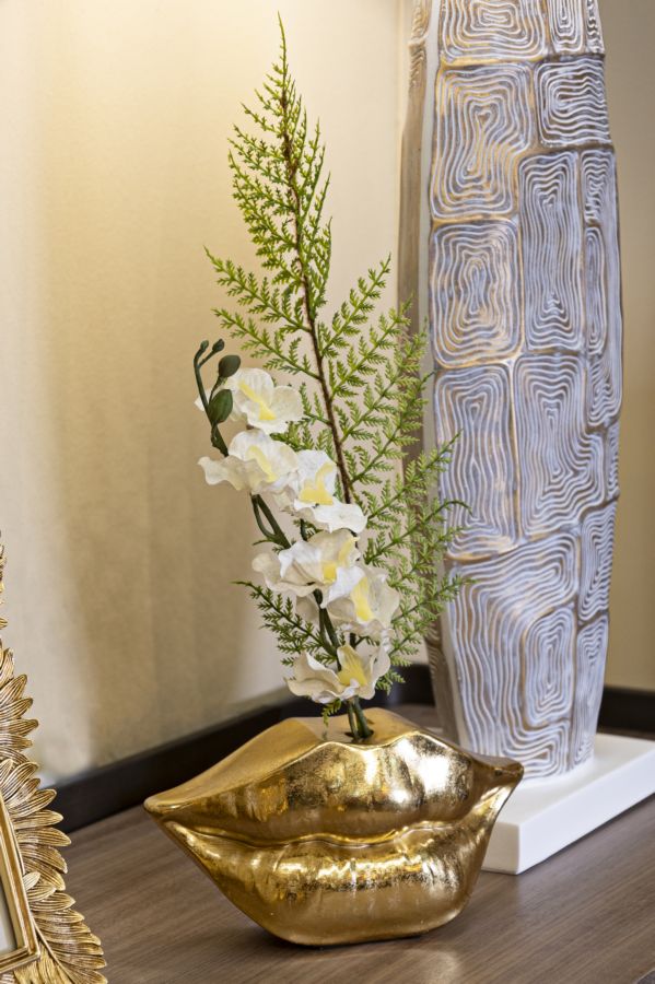 Descubra a elegância pura com o vaso GLAM, uma peça única em resina dourada que capta a essência do design contemporâneo. Com um formato encantador de lábios sorridentes, este vaso não é apenas um recipiente, mas uma verdadeira obra de arte que irá iluminar qualquer espaço. Fabricado em poliresina de alta qualidade, o vaso GLAM combina durabilidade e sofisticação, tornando-se a escolha perfeita para quem procura adicionar um toque de glamour e modernidade à sua decoração. Transforme o seu ambiente com este detalhe de luxo irresistível.