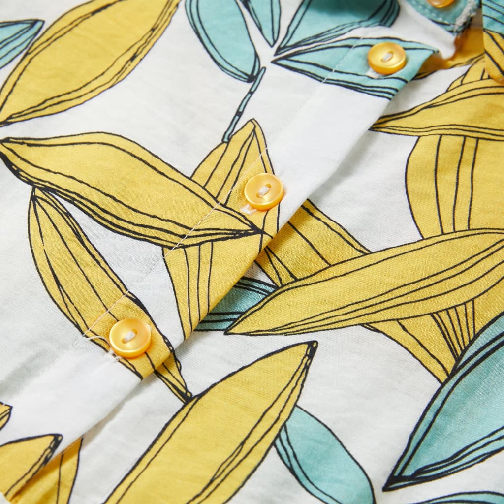 Este vestido para criança possui mangas curtas, uma gola virada e aperta na frente com botões. O vestido de criança está estampado com flores por toda a parte. O vestido curto para criança é feito de um material macio que inclui 80% de rayon e 20% de nylon, proporcionando um maior conforto e respirabilidade.