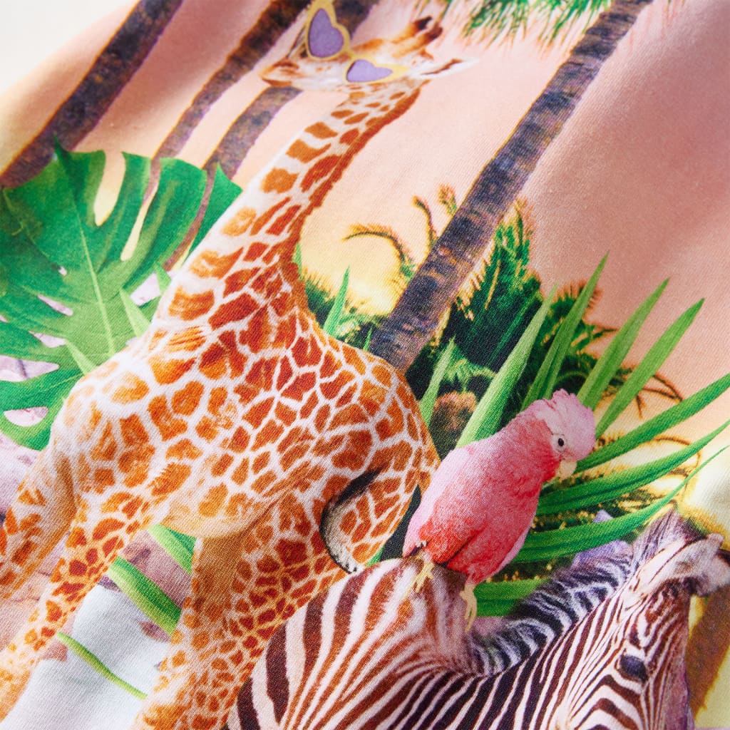 Este vestido para criança sem mangas possui um decote redondo e aperta com um fecho invisível nas costas. Este vestido infantil coral apresenta uma estampa de paisagem tropical com animais na parte da frente. O vestido curto para crianças possui laços na parte de trás que puxam ligeiramente as laterais, criando uma linha discreta sem ser demasiado apertada à volta da cintura. O vestido curto infantil é feito de um material macio que inclui algodão e elastano, proporcionando conforto e respirabilidade.