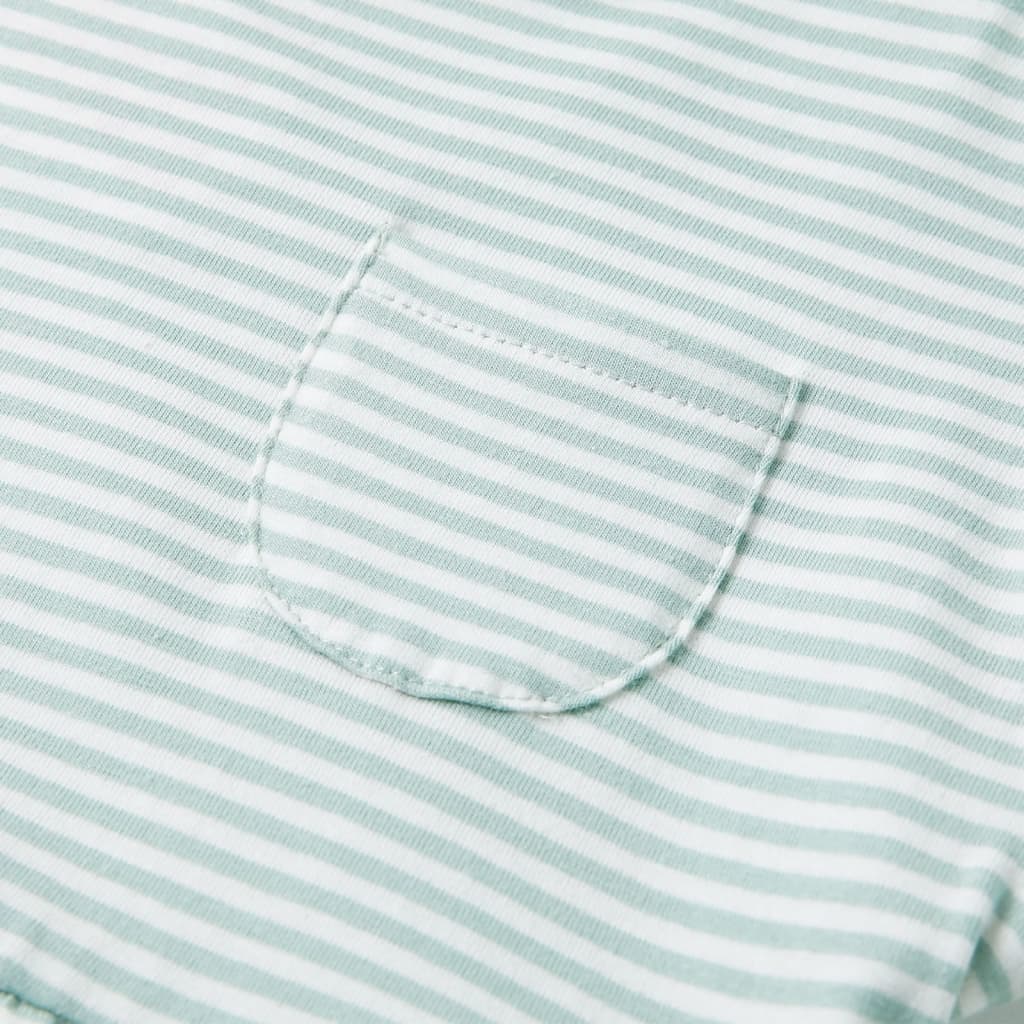 Este vestido para criança possui um decote redondo, mangas com folhos e um bolso no peito. Este vestido infantil cor menta apresenta riscas por toda a parte e é feito de um material macio, que inclui algodão e elastano, proporcionando conforto e respirabilidade.