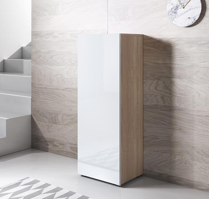 - Materiais: Estrutura em melamina brilhante, cor frontal em sonoma, porta universal, abertura com sistema push-click, tabuleiro traseiro fácil de perfurar