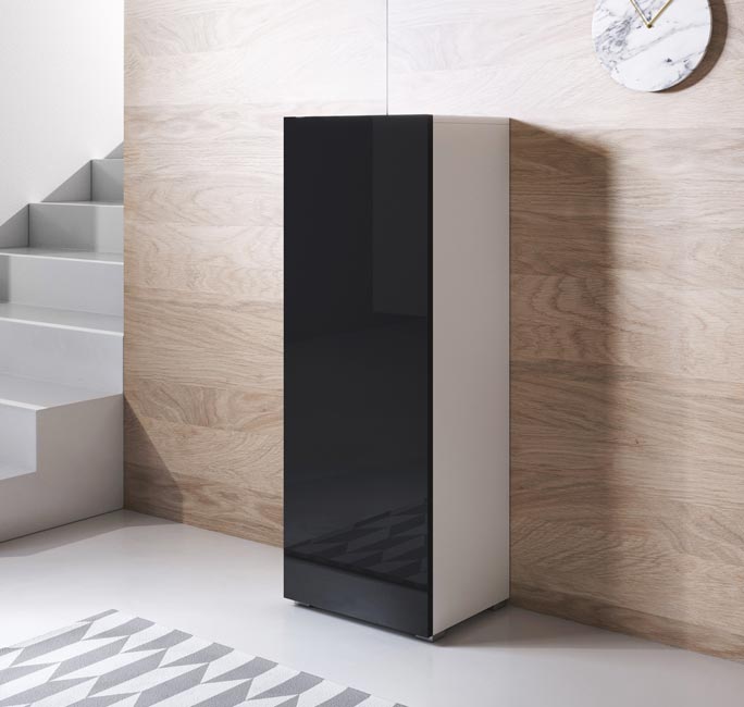 - Materiais: estrutura em melamina brilhante, frontal em melamina brilhante com canto reto, porta universal, abertura com sistema push-click, traseira em tabuleiro fácil de perfurar (para cabos)