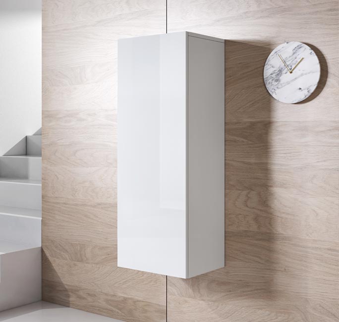 - Materiais: estrutura de melamina brilhante, frente de melamina brilhante com canto reto, porta universal, abertura com sistema push-click, painel traseiro perfurável para cabos