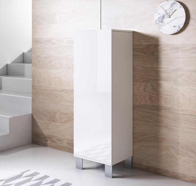 - Materiais: Estrutura em melamina brilhante, frontal em melamina brilhante com borda reta, porta universal, abertura com sistema push-click