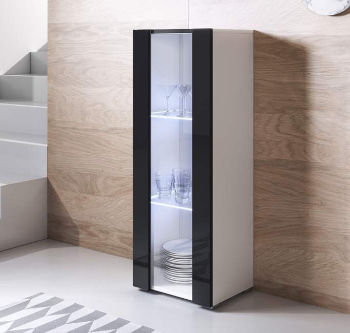 - Materiais: - Estrutura em melamina brilhante. - Frontal em melamina brilhante com canto reto combinado com metacrilato. - Estantes internos de vidro. - Abertura com sistema push-click. - Traseira em tabuleiro fácil de perfurar (cabos).