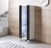 - Materiais: - Estrutura em melamina brilhante. - Frontal em melamina brilhante com borda reta combinada com metacrilato. - Prateleiras internas em vidro. - Abertura com sistema push-click. - Traseira: painel fácil de perfurar (cabos)