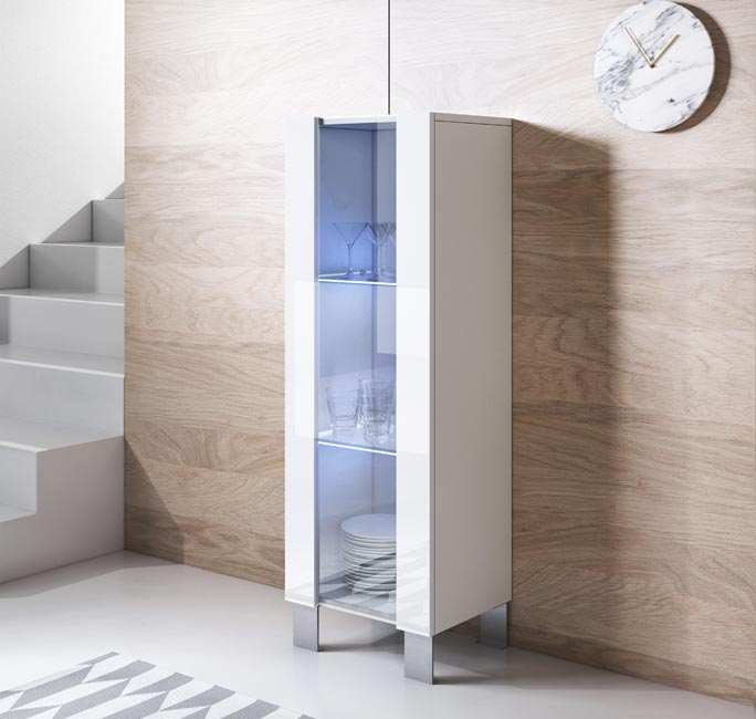 - Materiais: Estrutura em melamina brilhante, frontal em melamina brilho com cantos retos combinados com metacrilato, prateleiras internas de vidro, abertura com sistema push-click, traseira em tabuleiro fácil de perfurar (cabo)