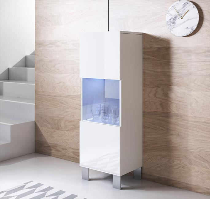 - Materiais: - Estrutura em melamina brilhante. - Frontal em melamina brilhante com canto reto combinado com metacrilato. - Estantes internos em vidro. - Abertura com sistema push-click. - Traseira em tabuleiro fácil de perfurar (para cabos).