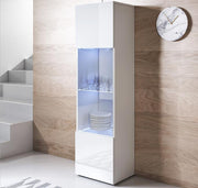 - Materiais: - Estrutura em melamina brilhante. - Frontal em melamina brilhante com canto reto combinado com metacrilato. - Prateleiras internas de vidro. - Abertura com sistema push-click. - Traseira: tabuleiro fácil de perfurar (cabos).