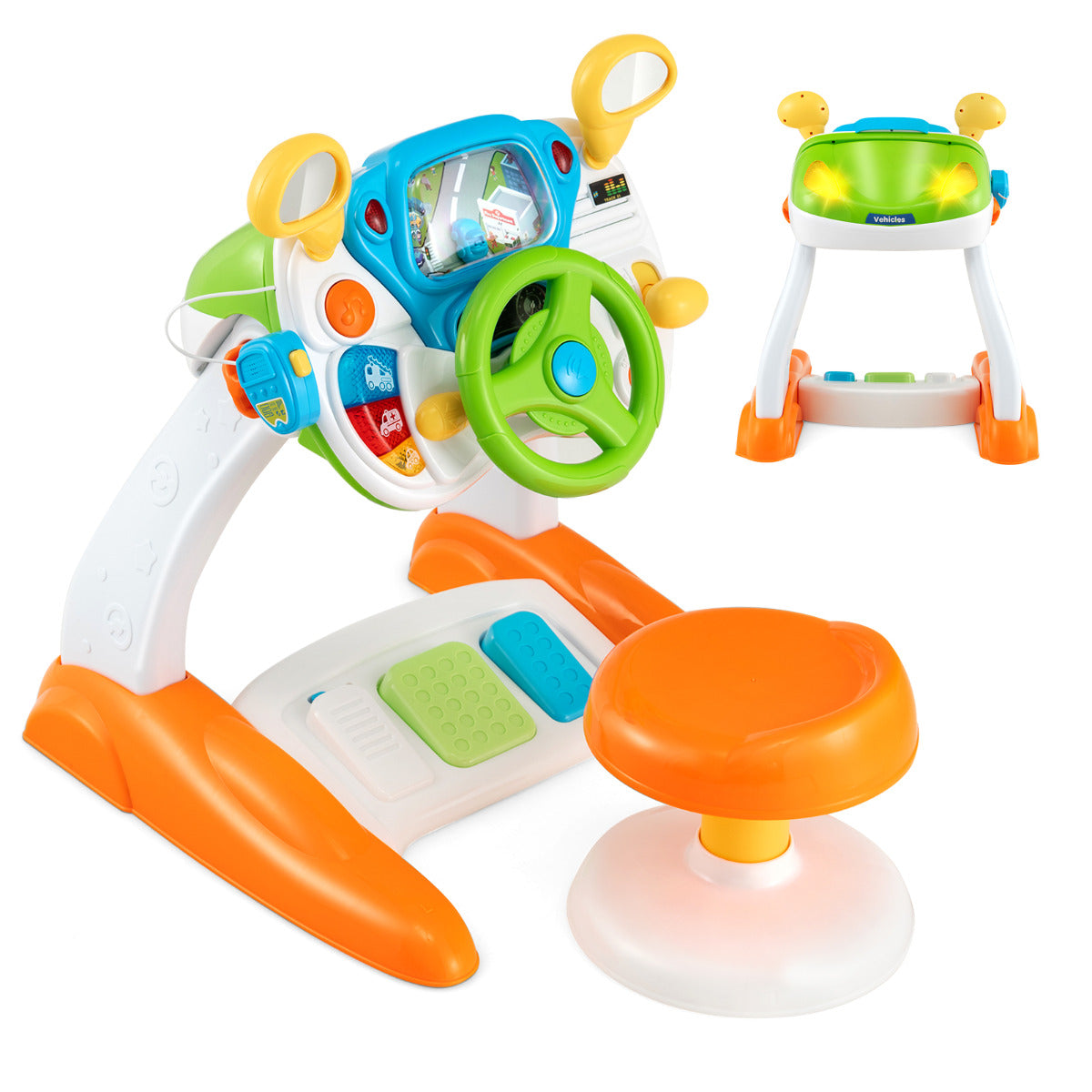 - Joga como um Condutor Simulado: As crianças pequenas podem controlar o carro no ecrã girando o volante. O pedal inferior tem um raio infravermelho que controla à distância o acelerador e o travão, oferecendo às crianças pequenas horas de diversão. Além disso, o design do megafone permite às crianças pequenas simular ser um condutor verdadeiro e pressionar para falar.