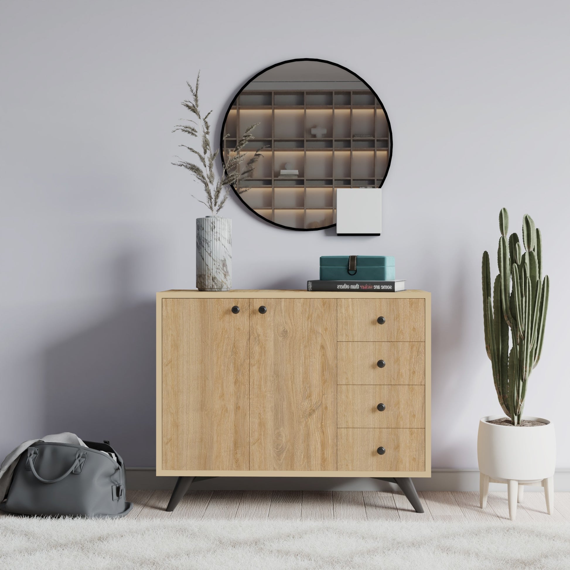 O design moderno e inovador deste armário adicionará um toque de sofisticação a qualquer ambiente. Seja seu estilo escandinavo, rústico ou algo entre os dois, este armário se integrará perfeitamente à sua decoração existente, enquanto adiciona um toque de elegância.